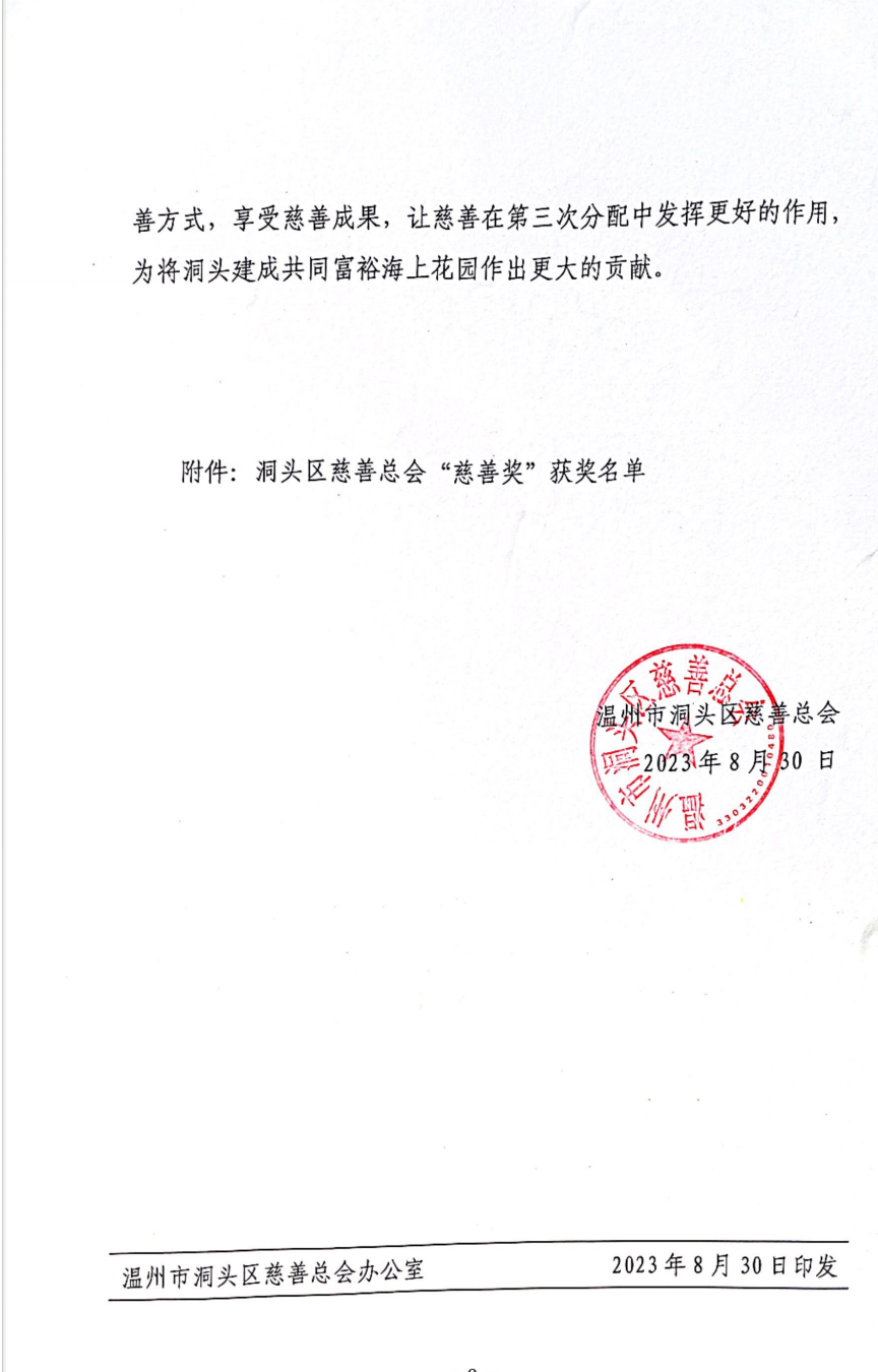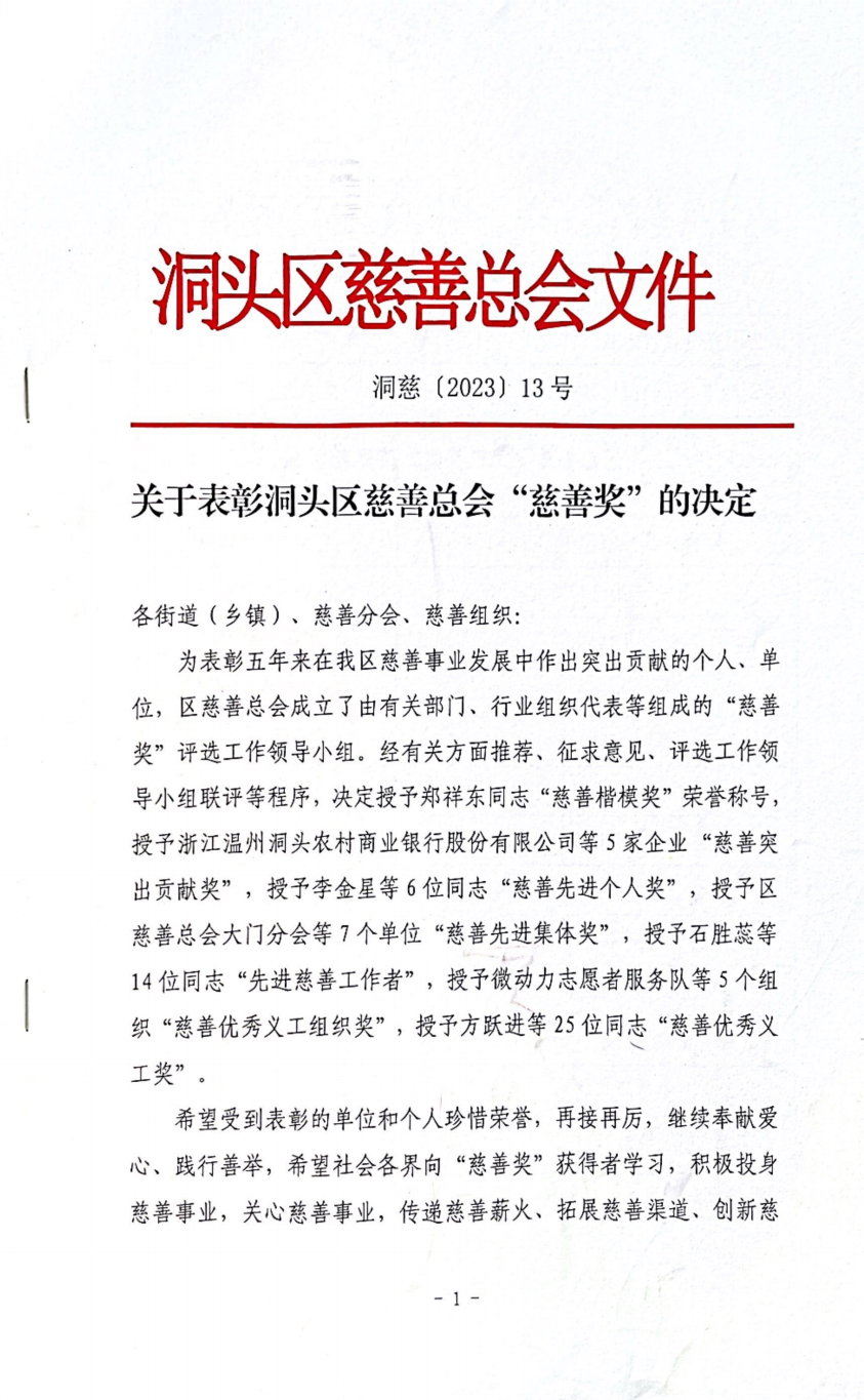 Decision on Commending the "Charity Award" of the Dongtou District Charity Association